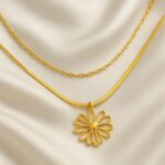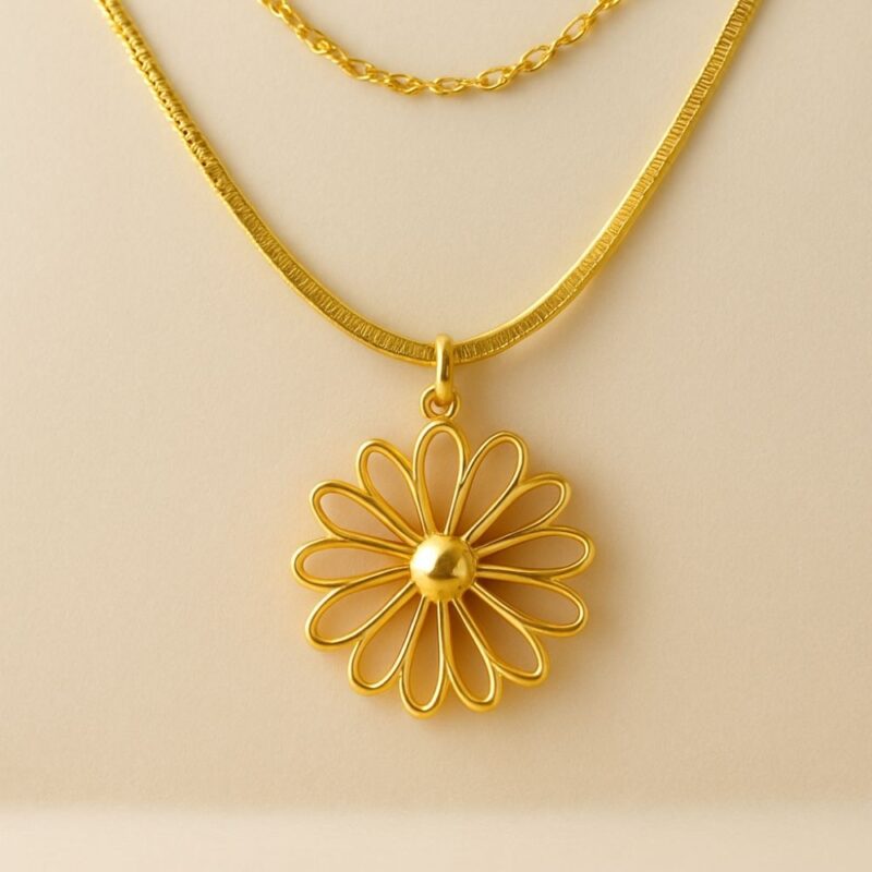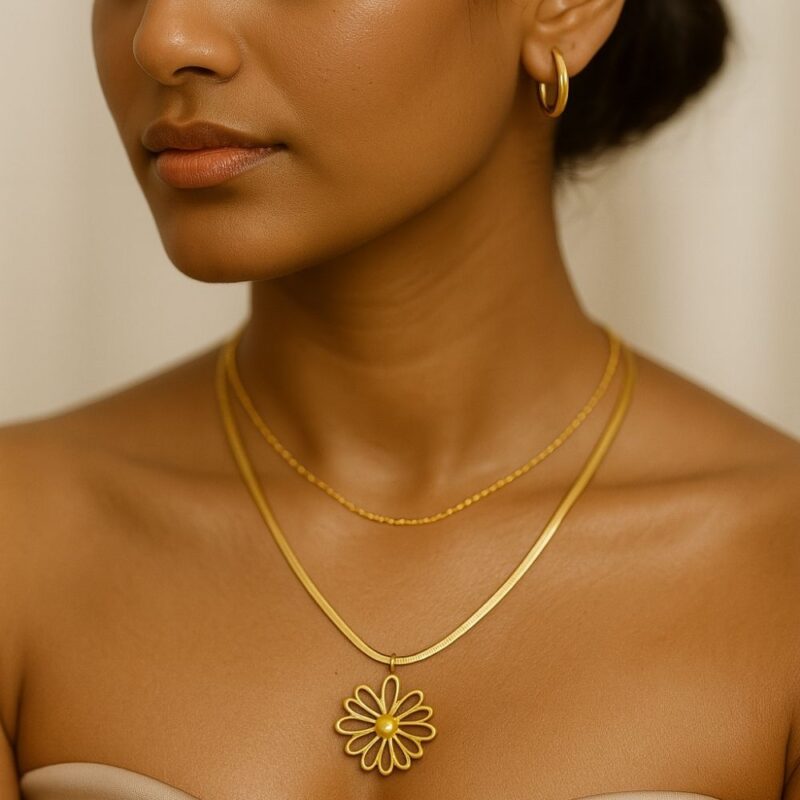 The longer chain features a hand-polished gold flower, open like a smile in springtime. Each petal dances around a solid golden centre — bold yet soft, structured yet open. It speaks of women who rise gently, bloom fully, and shine without noise. Paired with a second, daintier twisted rope chain, Meher gives a graceful layered look without effort or complication.