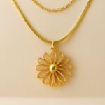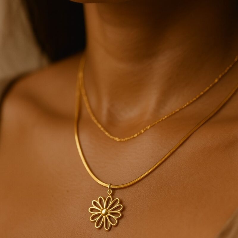 This layered necklace celebrates the quiet strength of femininity with a floral pendant blooming in golden curves. Floating delicately on your collarbone, Meher is more than jewellery — it’s a wearable moment of grace.