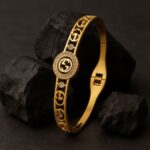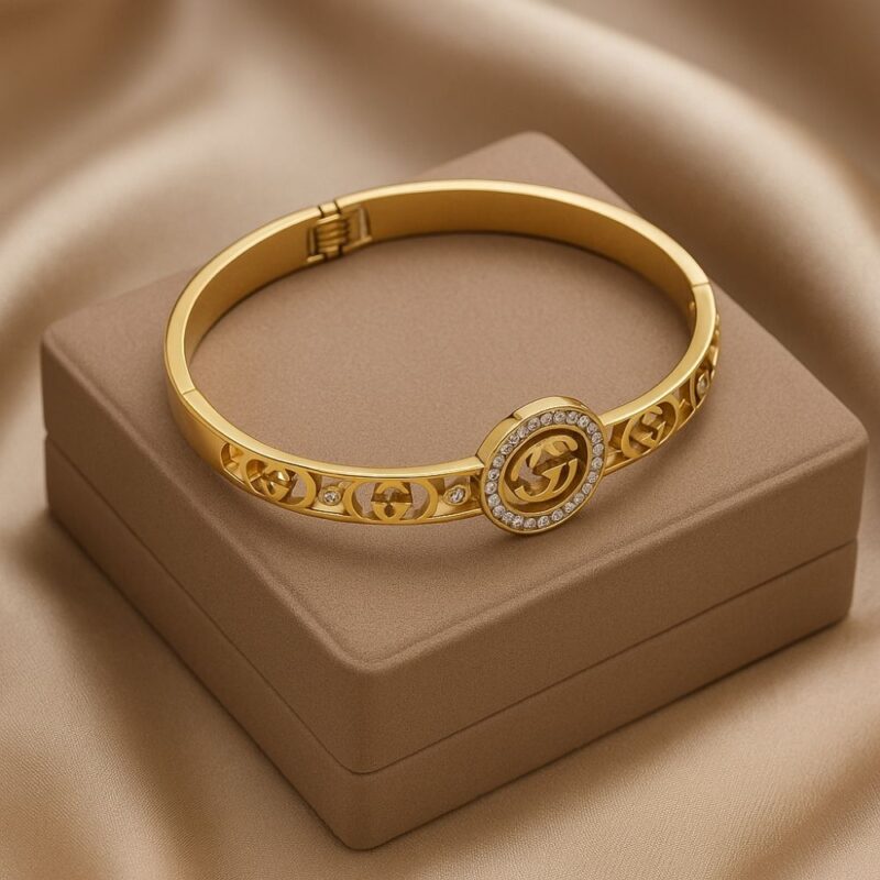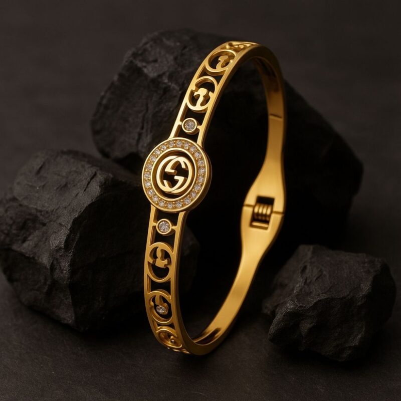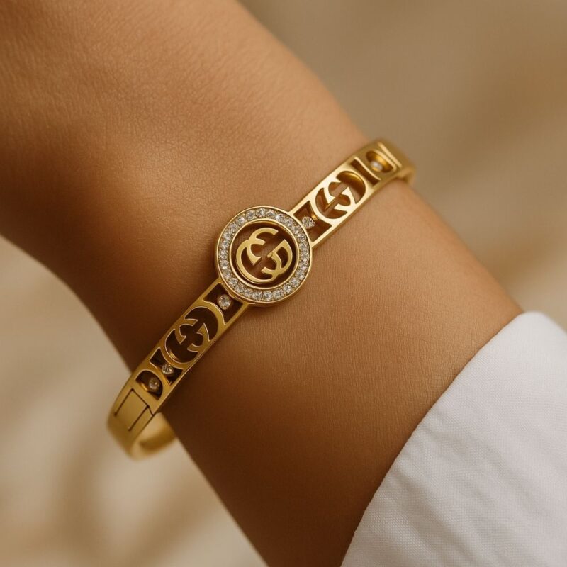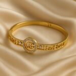 Crafted for the woman who walks like poetry and speaks with purpose, Raunak is your daily reminder that luxury is not just worn—it is lived. This statement bangle features a symmetrical silhouette with a regal medallion at the center, adorned with a pristine halo of sparkling crystals. The iconic double-G motif (intertwined gracefully) is flanked by shimmering cubic accents and precision-cut golden fretwork—making Raunak a harmony of tradition and modernity.